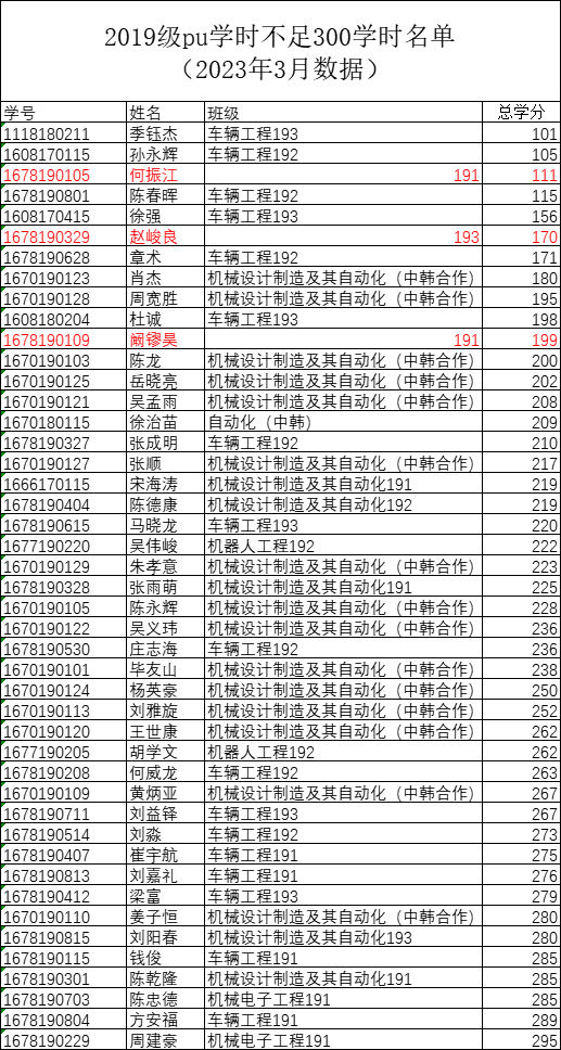表1 2019级pu学时不足300学时名单(含2021级专升本学时不足100名单)