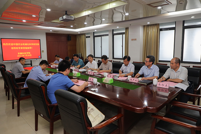 蒋德勤代表学校致欢迎辞,向鼎力支持我校牵手国字号研究院、谋求高质量发展的中国农业机械化科学研究院领导班子及相关部门负责人表示感谢,并向来宾简要介绍学校情况和第三次党代会确定的“三步走”发展战略以及机械工程学院办学情况。蒋德勤指出,《中共中央国务院关于全面推进乡村振兴加快农业农村现代化的意见》围绕加快推进农业现代化,明确提出要“强化现代农业科技和物质装备支撑”,提高农机装备自主研发能力,支持高端智能、丘陵山区农机装备研发制造;中国农业机械化科学研究院作为中国农业机械科学研究的领头雁,在高端装备制造、农业工程、信息技术与服务领域,拥有雄厚的科技创新、产品研发和成果转化能力;双方在学科建设、技术创新及产品研发、青年教师培养、学生联合培养及实习就业等方面开展深度合作,必将有利于充分发挥中国农业机械化科学研究院在农业装备研发和制造领域的综合优势和辐射效应,支持地方高校结合地域特色和多样化需求,加快提升小型化、信息化、智能化农机装备研发能力,更好地服务乡村振兴伟大实践;同时有利于我校借力发展,加速提升学科建设水平和科学研究、人才培养能力,助推我校实现“安徽科技大学”更名梦想。今年是中国共产党成立100周年,双方牵手合作是落实“学党史、悟思想、办实事、开新局”的重要举措,衷心期盼在全面推进乡村振兴、加快农业农村现代化的伟大征程中,在中国农业机械化科学研究院的大力支持下,切实创造国字号科研机构与地方高校牵手合作、共同发展的成功典范。