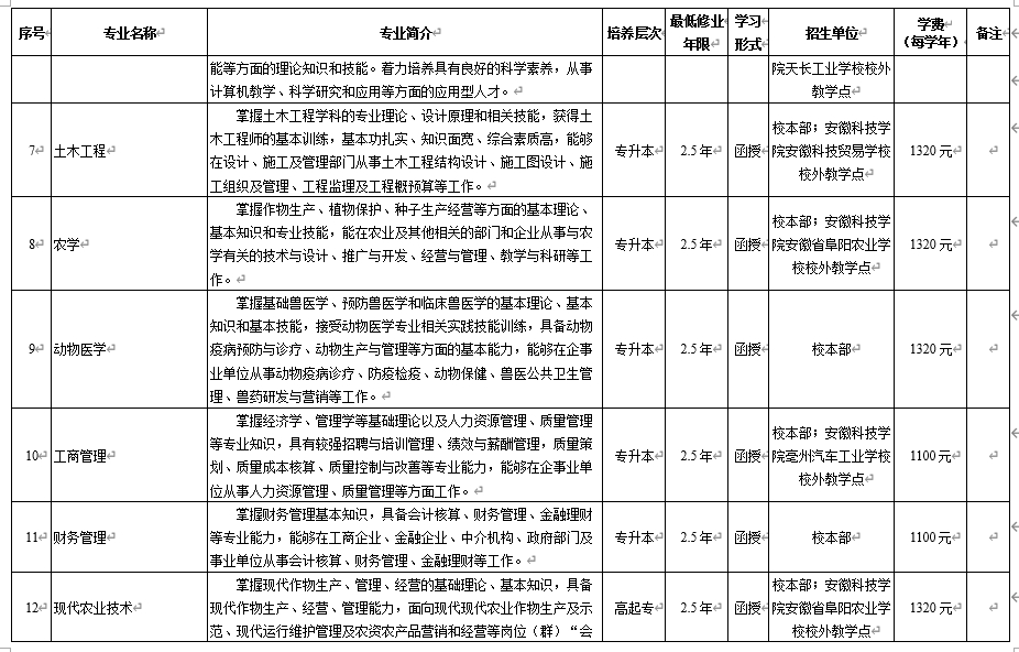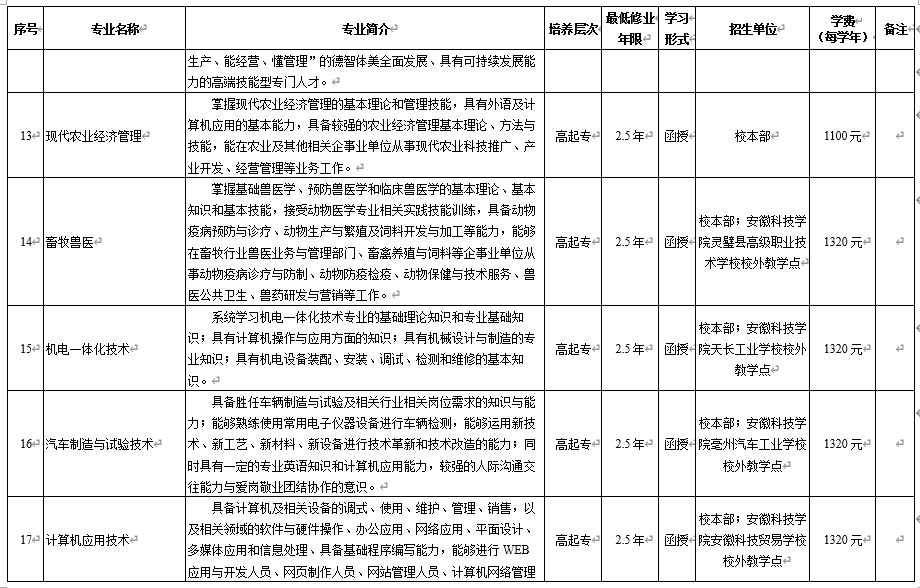 继续教育学院依托学校办学优势,主动适应市场需求,大力调整专业结构,现有计算机科学与技术、机械设计制造及其自动化、农学、动物科学、法学、现代农业技术、现代农业经济管理等本、专科招生专业。先后获批全国重点建设职教师资培养培训基地、国家级职业教育“双师型”教师培训基地、安徽省中职学校骨干教师综合类省级培训基地、安徽省新型职业农民培育基地、职业技能等级认定社会培训评价组织等机构,具有高等学历继续教育、职教师资培训及各类岗位培训等多种办学形式。我校学历继续教育自办学以来,一直以良好的教育质量、合理的收费标准和热忱为学员服务的作风受到了广大学员的普遍赞誉,已先后为社会各界培养、培训七万多名学员。