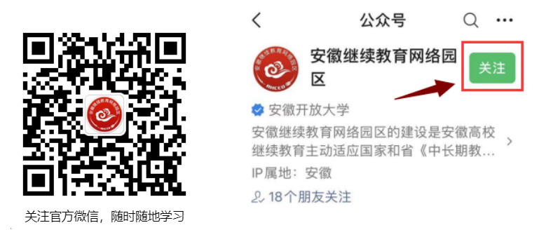 直接搜索“安徽继续网络园区”或扫码图5所示二维码关注园区公众号。