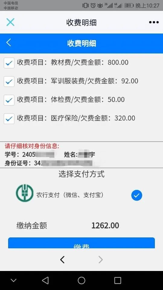 注意:非税费用(学费)和代收费用(书本费、网络学习资源费),这两类费用不能同时支付,需分两次完成。即,非税费用支付一次,代收费用支付一次。学生必须完成全部费用的缴纳。