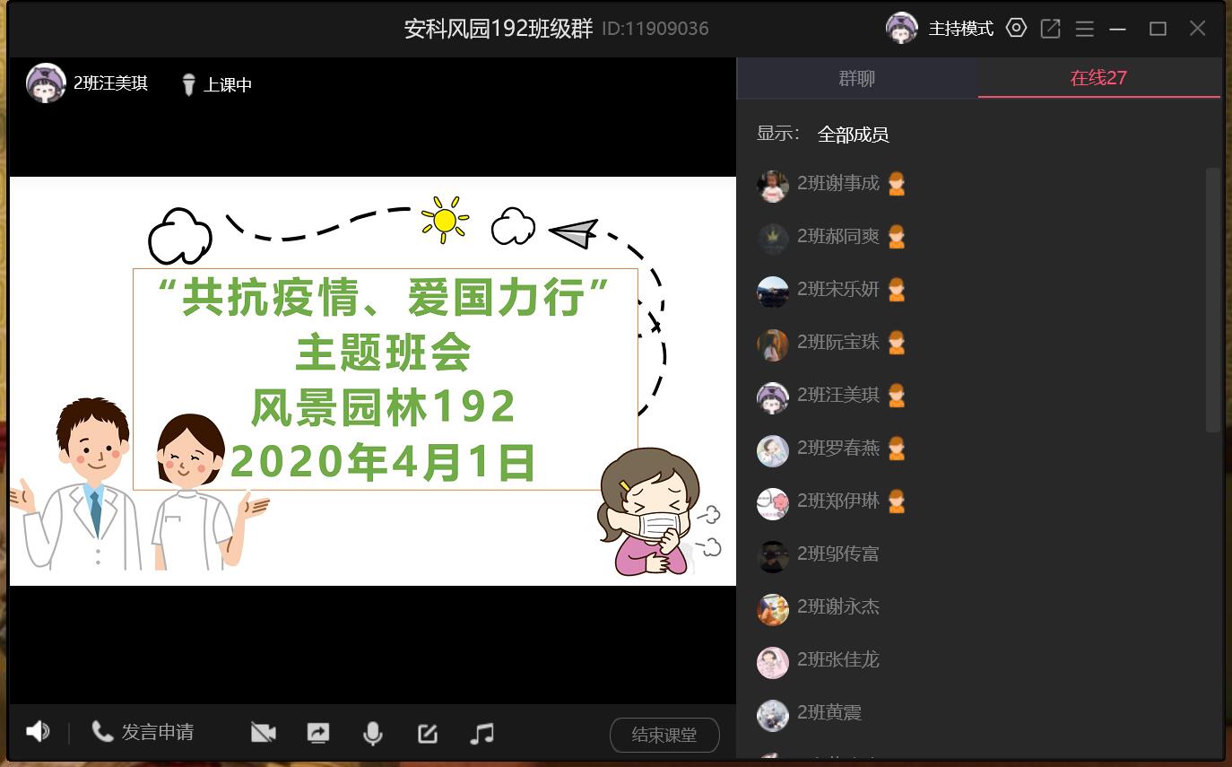 风景园林192班班会在庄严的国歌声中拉开序幕,会上例举了此次疫情中我们国家秉持人类命运共同体理念,携手抗疫的几件事例,充分彰显了中华民族同舟共济、守望相助的家国情怀。