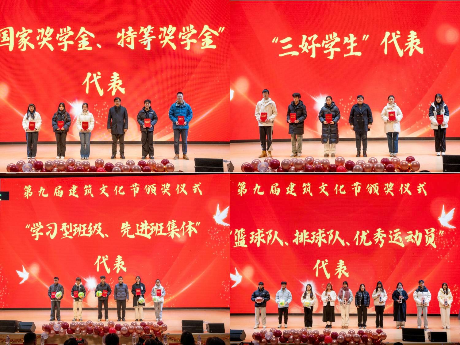 闭幕式上,通过开场视频,回顾了第九届建筑文化节自2024年3月启动以来,围绕学生“德智体美劳”先后开展的“立德铸魂、促学益智、强体育心、炼技蕴美、崇劳践行”等五大板块中的精彩瞬间和取得的成绩,走出了一条具有建筑特色、不断创新的校园文化品牌之路,启迪了同学们的思想和才智,锻炼了同学们的才艺和特长等。与此同时,学院领导和老师分别为在第九届建筑文化节立德、益智、体育、美育和社会实践中表现突出的集体和个人颁发了证书、奖品,并进行了合影留念。