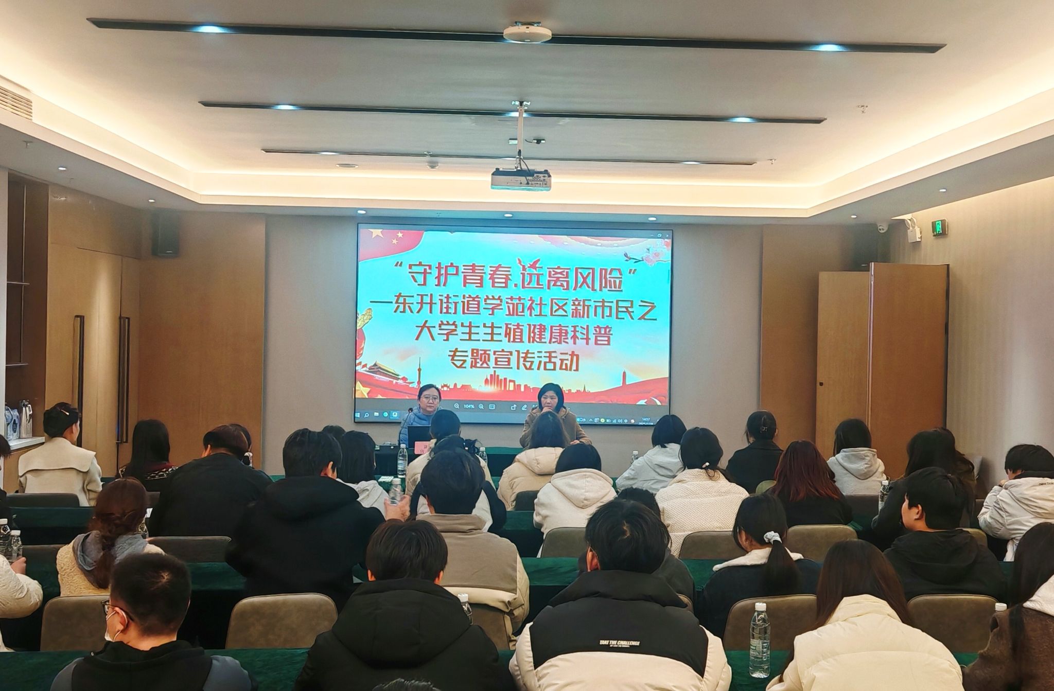 第115个国际妇女节即将到来之际,为维护大学生权益,筑牢健康防线,2月28日,大学生社区实践共建单位龙子湖区东升街道学苑社区开展“守护青春 远离风险”大学生生殖健康科普宣传专题讲座,活动特邀蚌埠医科大学第一附属医院妇产科专家宫莹莹担任主讲,来自建筑学院、电气与电子工程学院50余名学生参加。