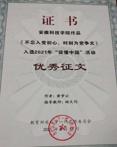 日前,在教育部关工委开展的 “读懂中国”活动中,MILAN.COM关工委获2021年“读懂中国”活动优秀组织奖,选送的征文《不忘入党初心,时刻为党争光》获优秀征文奖。