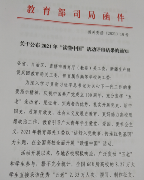 为深入学习贯彻习近平总书记对关心下一代工作的重要指示精神,庆祝中国共产党成立100周年,充分发挥“五老”亲历者、见证者、实践者的优势,扎实开展党史、新中国史、改革开放史、社会主义发展史教育,更好助力高校思想政治工作,教育引导广大青年学生爱党、爱国、爱社会主义,2021年教育部关工委以“讲好入党故事,传承红色基因”为主题,在全国高校全面开展“读懂中国”活动。