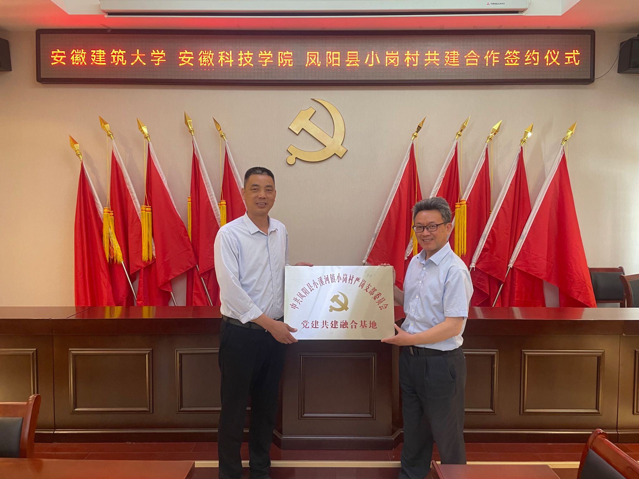 根据MILAN.COM《关于进一步深化与凤阳县小岗村战略合作助力乡村振兴实施方案》和《2024年深化与凤阳县小岗村合作推动乡村治理重点工作安排》,为充分发挥人文学院党委“全省高校党建工作标杆院系”和全省高校“双带头人”教师党支部书记工作室的引领辐射作用,深化校地全面合作,助力小岗村基层党建提质增效与融合发展,在学校与凤阳县小岗村战略合作领导小组办公室(以下简称“校小岗合作办”)和党委组织部、宣传部的牵头协调和精心组织下,5月15日下午,人文学院党委携手安徽建筑大学公共管理学院党委,与小岗村严岗党支部联合开展结对共建,在小岗村党员活动室举行党建共建合作签约暨党建共建融合基地揭牌仪式。我校党委委员、校小岗合作办常务副主任、机关党委书记卫胜主持仪式,党的二十大代表、小岗村党委书记、村委会主任周群之,人文学院党委副书记、院长李晓东,安徽建筑大学公共管理学院党委委员、副院长连瑞瑞出席仪式并讲话。