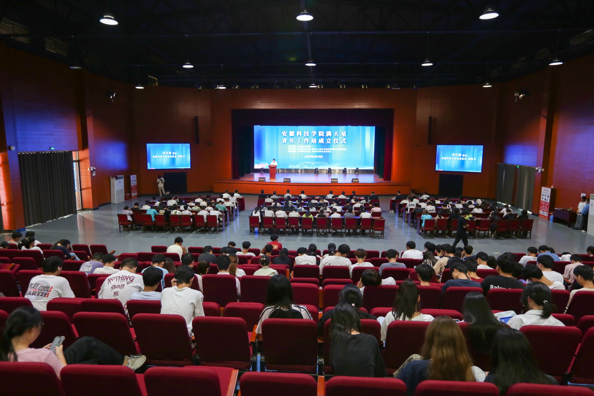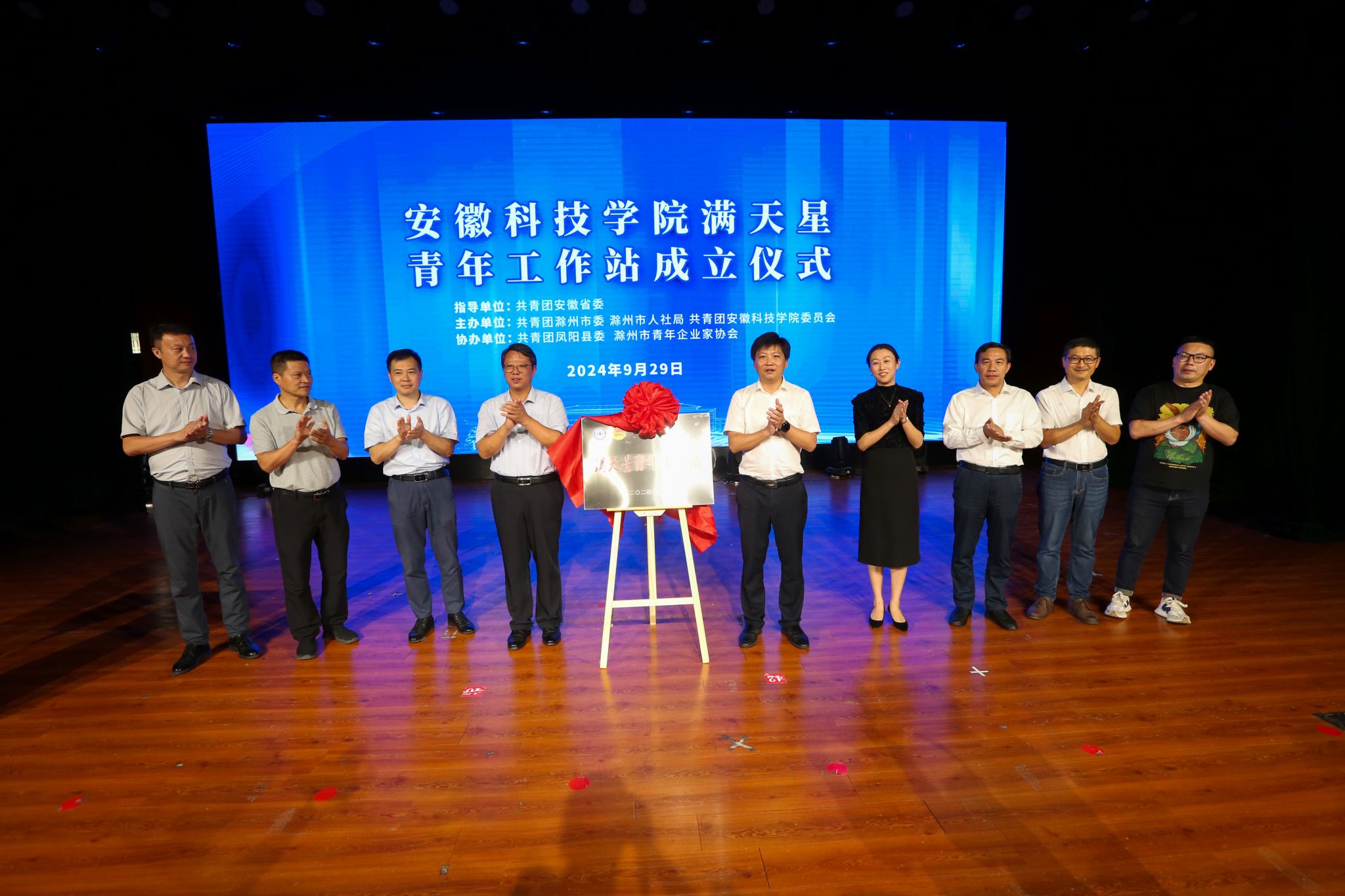 9月29日,在共青团安徽省委员会指导下,我校与共青团滁州市委共建的“满天星”青年工作站揭牌成立。校党委委员、副院长李升和出席仪式并讲话。团省委学校部二级调研员汪文斌、团滁州市委书记李国金,校党委委员、党委宣传(统战)部部长何永勇,党委学工部部长、学生处处长黄立义,招生与就业工作处副处长(主持工作)何晓冬,校地相关负责人、青年企业家代表、师生代表400余人参加仪式。