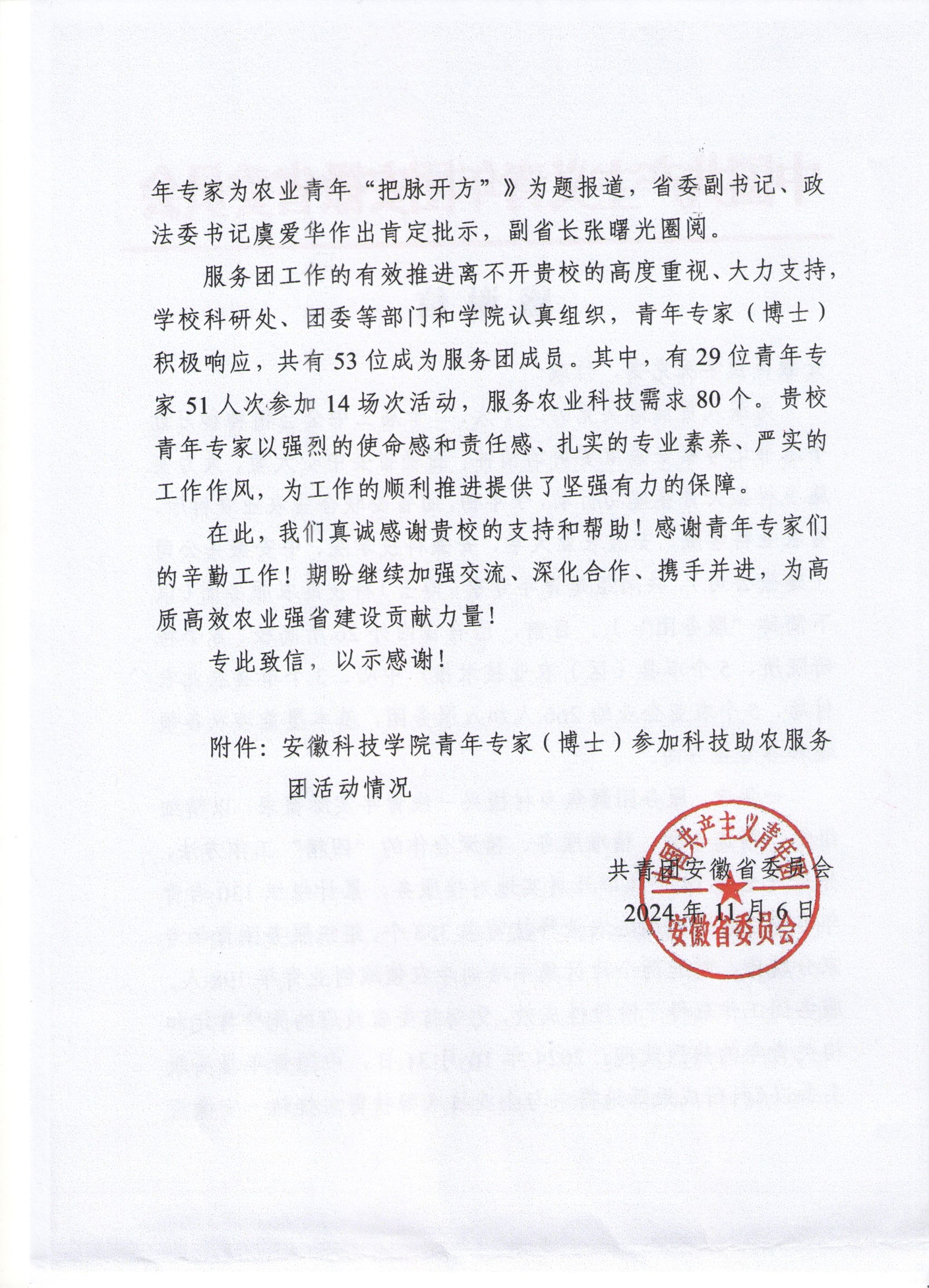 近日,共青团安徽省委员会向我校发来感谢信,感谢我校青年专家(博士)在科技助农服务团中付出的辛勤工作,并表述期盼继续加强交流、深化合作、携手并进,为高质高效农业强省建设贡献力量。