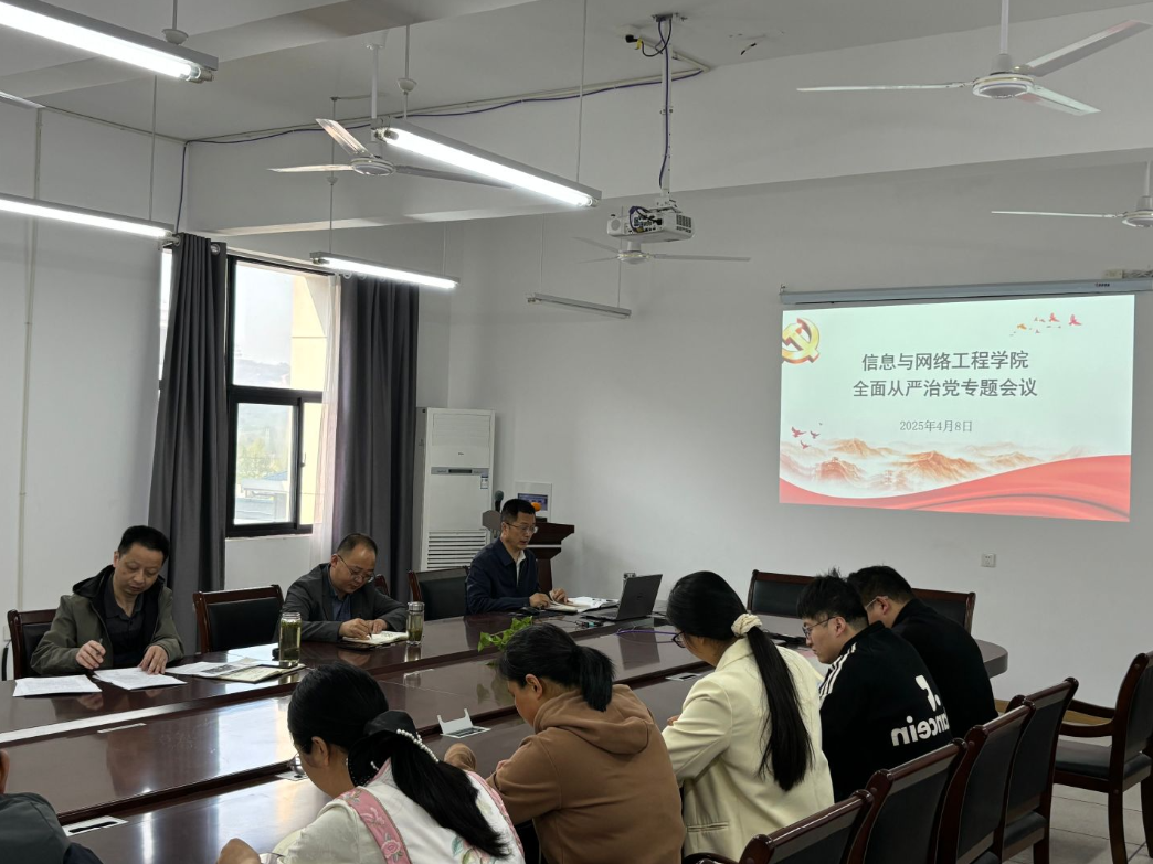 4月8日上午,信息与网络工程学院在龙湖校区尚行楼B418会议室召开全面从严治党专题会议。学院党委委员、纪委委员、各党支部书记、各系部主任、实验室主任及科级以上干部参加会议。会议由学院党委书记王振其主持。