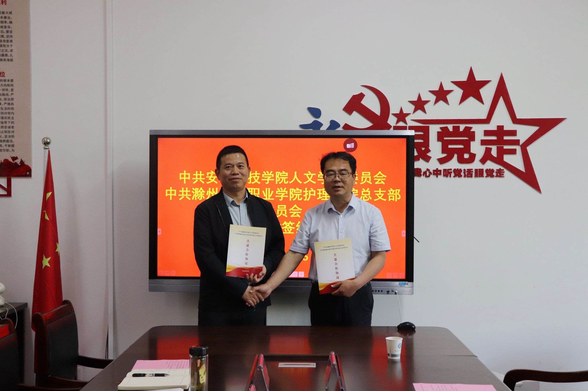 4月25日下午,人文学院党委书记、院长李晓东一行4人赴滁州城市职业学院护理学院,参加党建共建合作签约授牌仪式。仪式由滁州城市职业学院护理学院教工党支部书记、副院长李勋华主持,双方围绕党建共建目标推进合作事宜。
