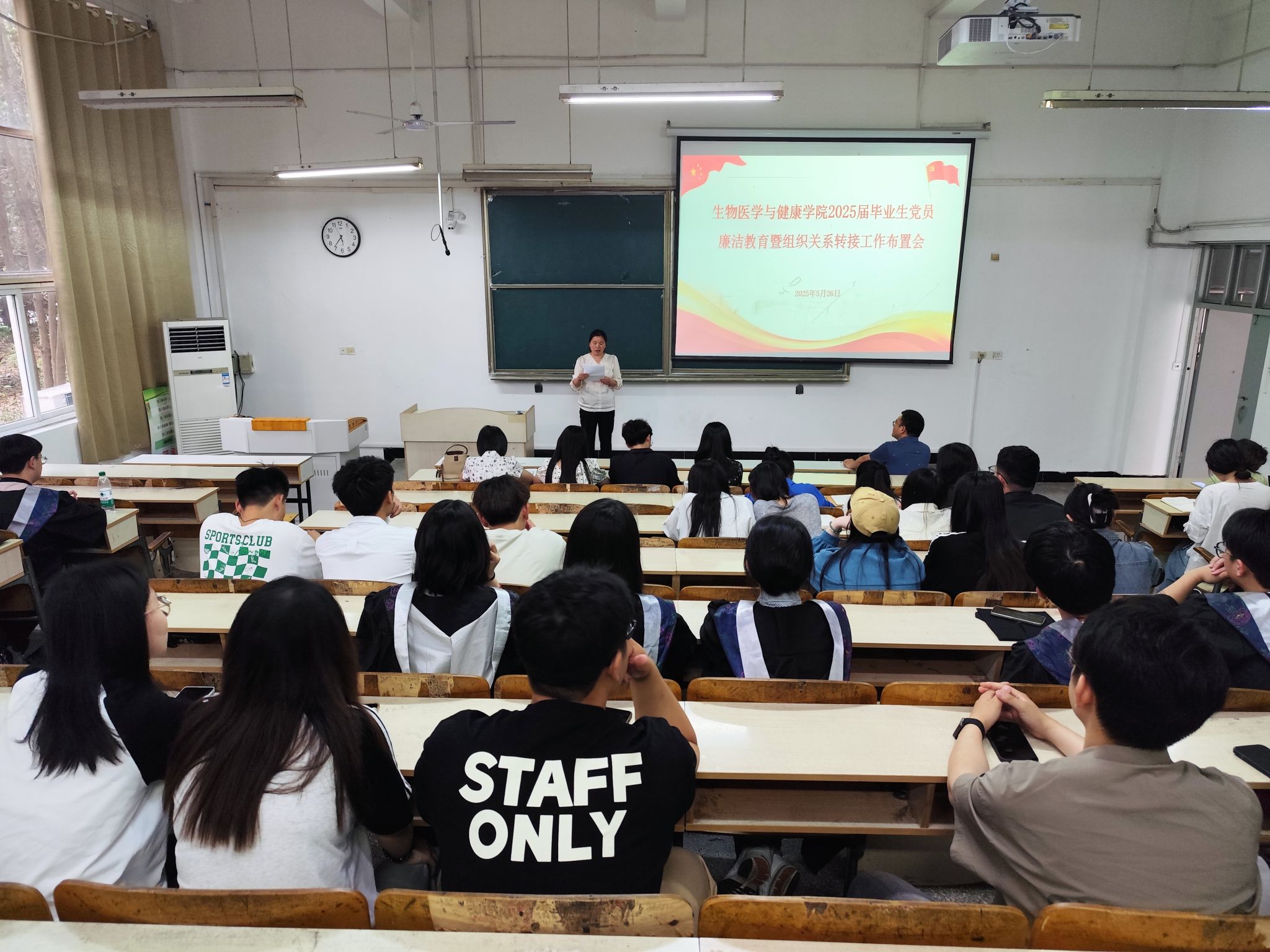 5月26日下午,生物医学与健康学院在求知楼A107教室开展2025届毕业生党员廉洁教育。学院党委副书记、纪委书记彭丽萍,各学生党支部书记和全体毕业生党员参加会议。会议由学院党委委员、党政办公室主任王传林主持。