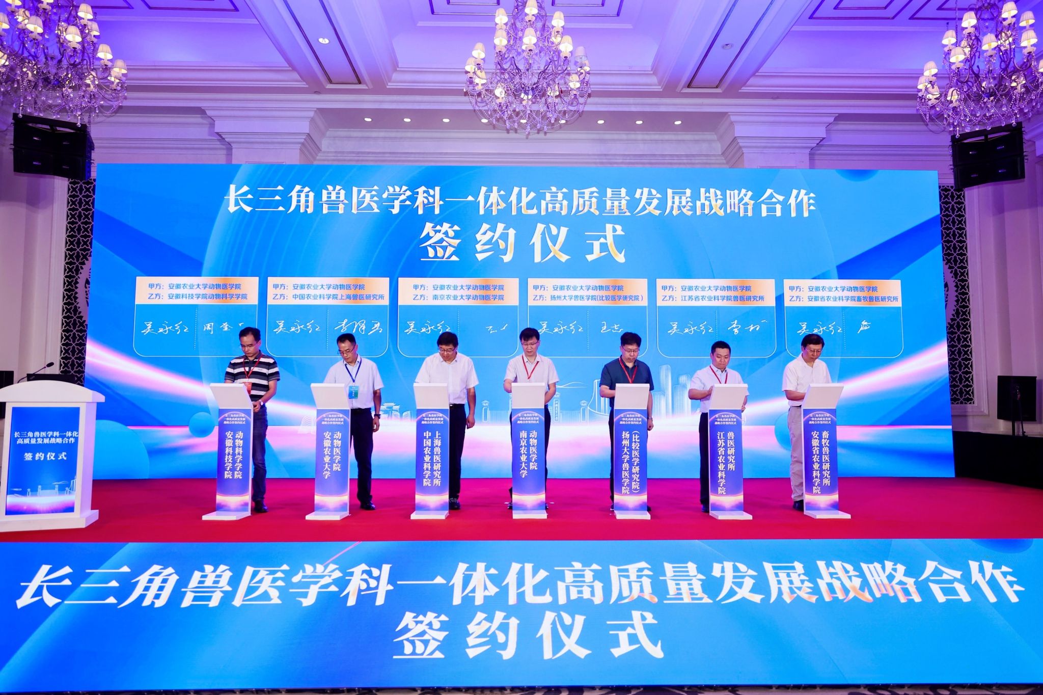7月12日,由安徽省农业农村厅、安徽农业大学主办的第一届One Health 未来兽医学术研讨会暨安徽省第四届动物性食品安全与疫病防控论坛在合肥举行,我校动物科学学院党委副书记、副院长周金星(主持工作)代表学院与安徽农业大学动物医学院签订战略合作协议。