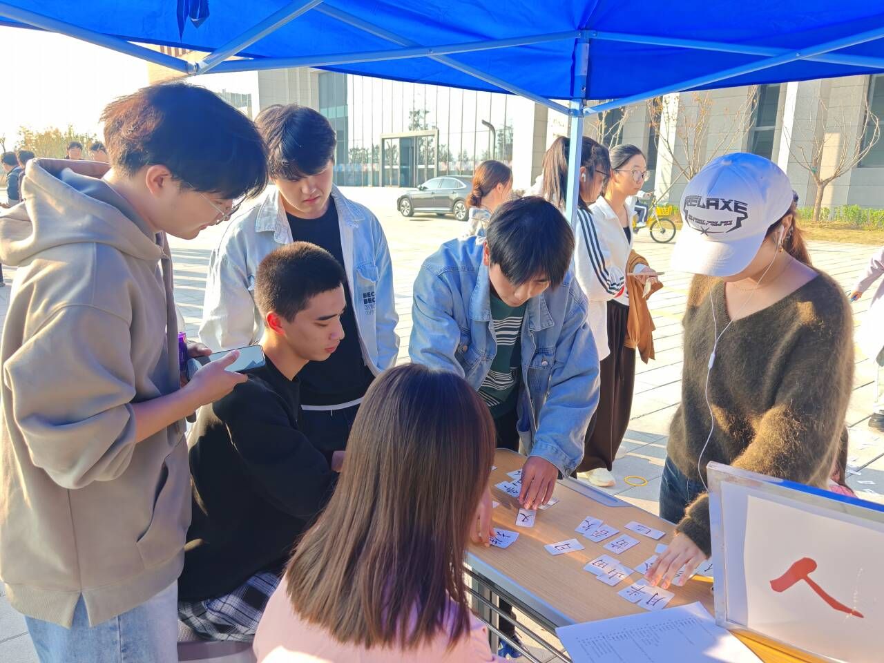 活动现场布置井然有序,工作人员提前到位,将各类游戏道具、字牌等物料摆放妥当,以饱满热情迎接同学们的到来。本次活动设置“套字组词”和“校史问答”两大趣味环节,兼具知识性与互动性。在“套字组词”环节,五彩斑斓的套圈在空中划出一道道优美弧线,同学们瞄准带有部首的字牌精准投掷,套中后便围坐一团热烈讨论,齐心协力将零散字牌拼合成完整汉字,再延伸组建成连贯词语,现场欢声笑语不断;“校史问答”环节则以轻松问答的形式,将校史沿革、办学成就等知识点融入其中,由一个个鲜活的校史故事串联起学校75载风雨征程。