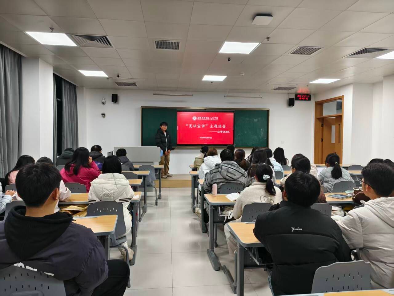 宪法宣传周期间,人文学院各班级积极召开“弘扬宪法精神 争做法治青年”主题班会。班会上,同学们集中观看宪法宣传公益视频。视频以生动形象的动画、真实鲜活的案例,通俗易懂地阐释了与青年成长成才息息相关的宪法权利与义务,让“治国安邦总章程”变得可感、可触、可亲。同学们结合自身学习生活实际,交流心得体会。大家一致表示,将以此次活动为契机,把宪法精神内化于心、外化于行,努力成长为有理想、有本领、有担当的新时代法治青年。