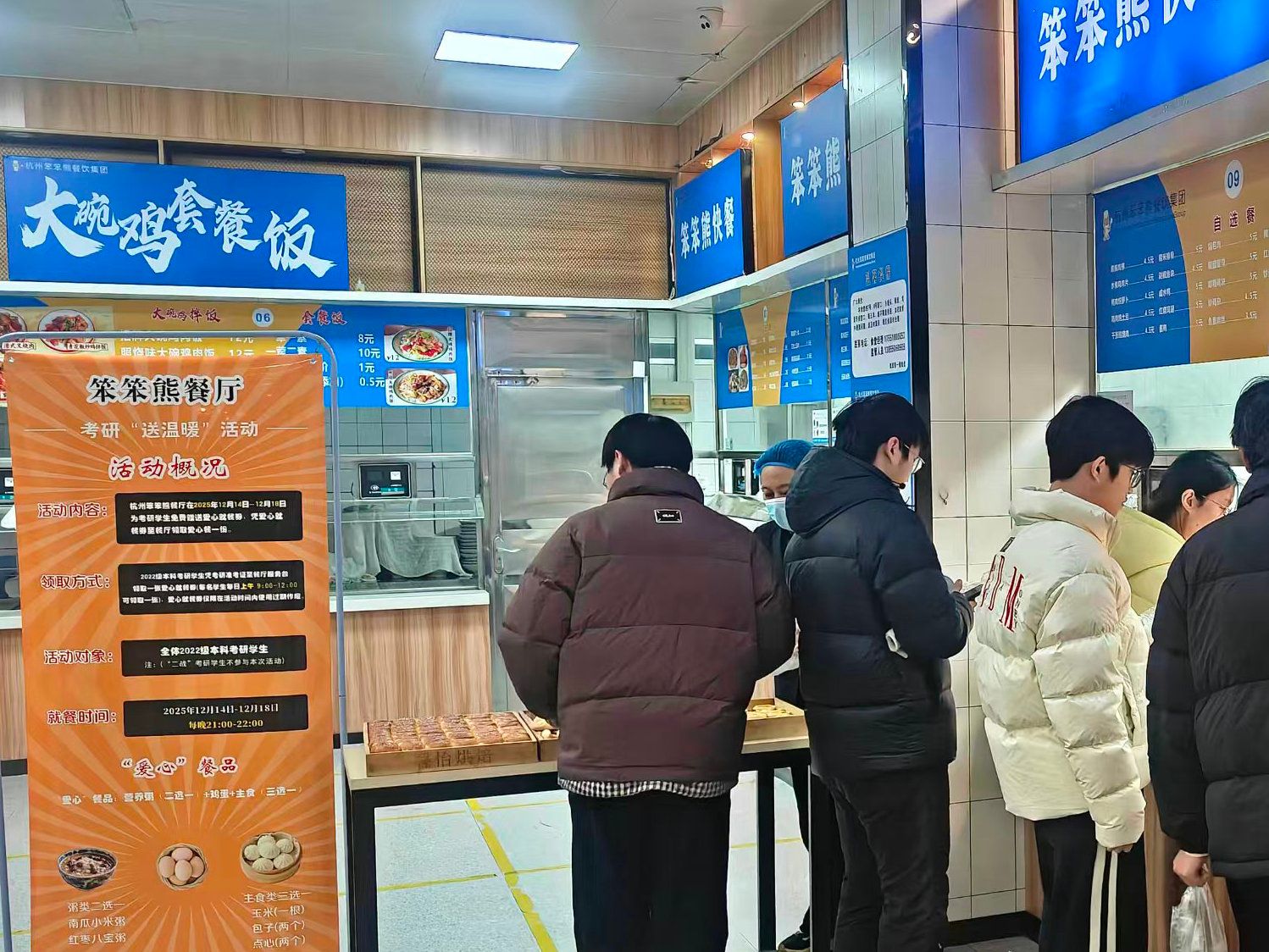 各食堂精心筹备了一系列暖心活动,为考研学子的逐梦之旅增添温暖与力量。一杯姜茶、一碗热粥、一个鸡蛋、一份关怀,食堂阿姨们为每个考研学子免费精心准备了各种美食,包含寓意的“状元及第”莲子粥、“蒸蒸日上”大肉包、“锦上添花”发糕等等,当一碗碗银耳莲子粥、一杯杯生姜红糖茶传递到同学们手中,即暖手又暖心,瞬间驱散了学子们身上的寒意。许多同学在接过时连声道谢,简直是暖到心坎里了。众学子纷纷表示,在这分秒必争的考研倒计时里,学校的这份关怀犹如冬日暖阳,给予了他们极大地鼓舞。