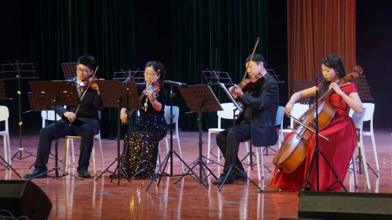 本次音乐会以“各美其美,美美与共”为核心艺术表达,曲目编排匠心独运,生动诠释了文化自信与包容开放的时代理念。演出伊始,校学生器乐协会弦乐团以经典曲目《欢乐颂》率先登台,明快激昂的旋律瞬间点燃现场氛围,赢得阵阵掌声;随后,弦乐四重奏组深情演绎《梁祝》,悠扬婉转的曲调将千古流传的爱情故事娓娓道来,尽显东方古典美学韵味;蚌埠市音乐家协会室内乐团徐强志、王琴妹、赵和平、王苹4位老师联袂奏响《采茶》,清新明快的节奏勾勒出浓郁的乡土风情,让师生深切感受中华优秀传统文化的独特魅力。