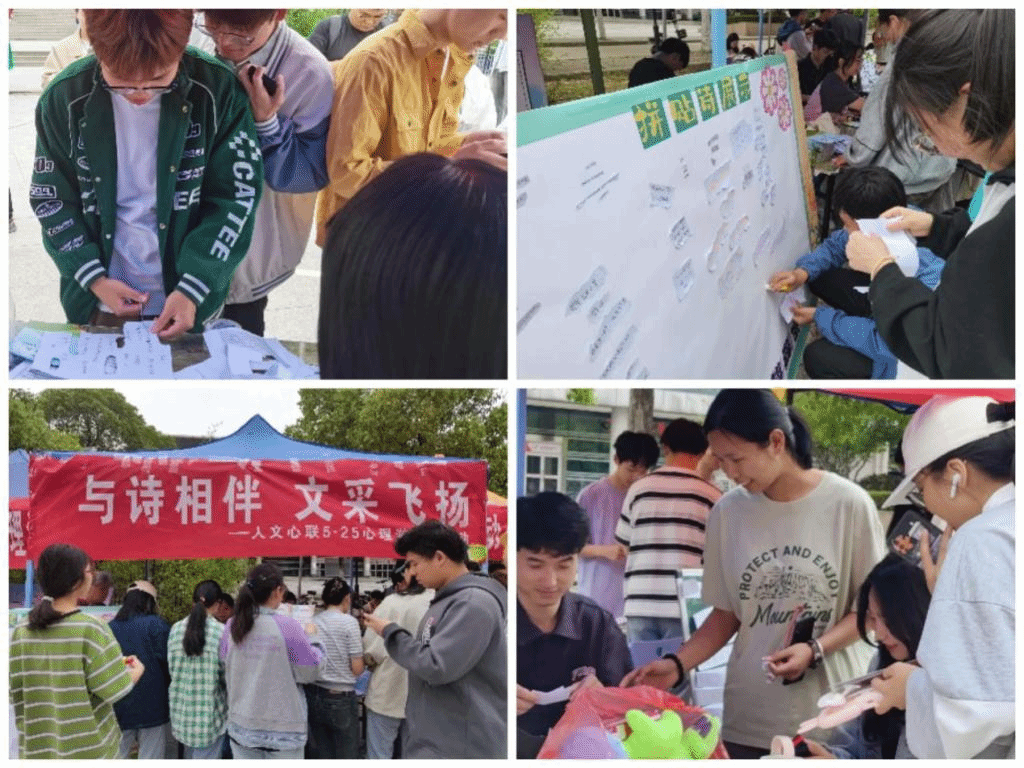 为增强学生的文化底蕴,提高学生的人文素养,通过积极健康的活动促进学生的身心健康发展。5·25大学生心理健康月“一院一主题”心理游园会活动于5月24日下午在西区广场开展。本次活动我院开展了以“与诗相伴,文采飞扬”为主题的专业特色活动以及飞花令、拼贴诗、你做我猜等现场互动游戏。在活动现场,同学们踊跃参与游戏,完成游园会打卡活动,沉浸在欢乐的氛围之中。老师们也亲临心理游园会活动现场,与大家一同体验活动乐趣,体现了学校对心理健康教育工作的高度重视。