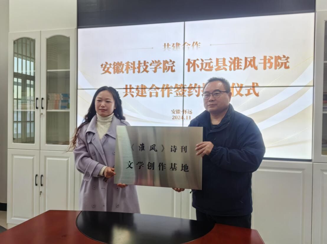 李晓东回顾了人文学院在诗歌创作、常遇春研究等方面与怀远文化界的交流互动情况及取得的阶段性成果;强调此次与淮风书院正式签约开展共建合作,既是我校推进大学生诗歌创作、弘扬优秀传统文化的自觉担当,也是打造汉语言文学专业认证特色的重要举措。宫蔚国表示要以此次签约共建为新起点,充分发挥各自优势,积极创新合作模式,为青年学生提供更加广阔的实践平台,为传承与发展新时代诗歌文化贡献更多力量。