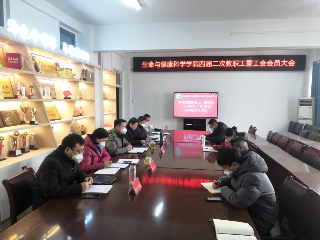 12月30日上午,生命与健康科学学院在学知楼417室召开四届二次教职工暨工会会员大会,受疫情影响,本次大会采取线上和线下相结合的方式举行。学院党委书记詹学文,党委副书记、副院长(主持工作)孙玉军,党委副书记、纪委书记彭丽萍,党委委员、副院长钱立生,院工会主席杨子龙以及学院党政办公室人员在会议室主会场线下参加会议,其他教职工通过线上腾讯会议的方式参加大会。
