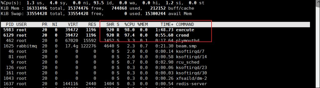 Linux主机中挖矿病毒后的现象如下图所示: