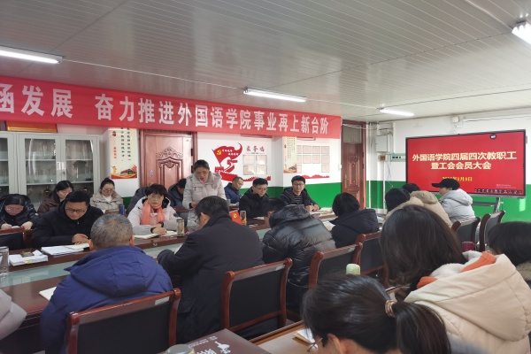 1月3日下午,外国语学院四届四次教职工暨工会会员大会在学院会议室举行。大会主题为“坚守初心 勇担使命 奋力开创外国语学院高质量发展新局面”,大会由学院党委书记蔡为青主持,学院全体教职工参加会议。