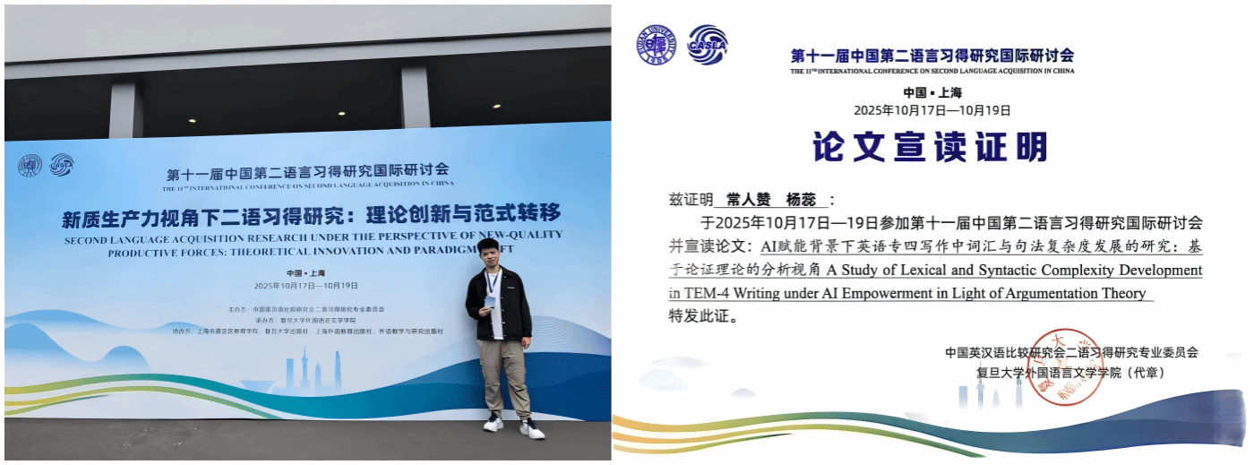 2025年10月17日至19日,第十一届中国第二语言习得研究国际研讨会在复旦大学召开。外国语学院三项研究成果入选核心分论坛汇报,涵盖积极心理学干预、AI赋能教学与语言测试优化方向。
