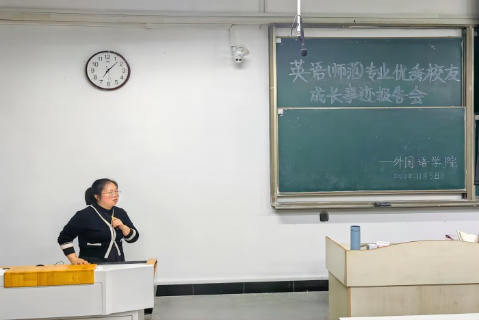 为厚植教育情怀,引导师范生做好职业规划,11月5日晚,外国语学院在求知楼A座107教室组织英语(师范)专业优秀校友成长事迹报告会之二:永不放弃,做好当下。本次报告会邀请了我校2014届英语(师范)专业优秀毕业生、滁州市最美教师王容容分享个人成长事迹。学院2022级全体英语(师范)专业学生聆听报告。报告由学院党委副书记张海亮主持。