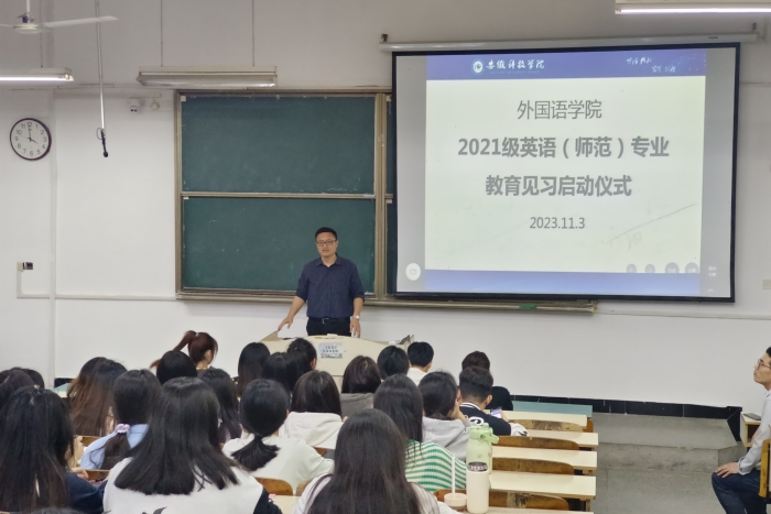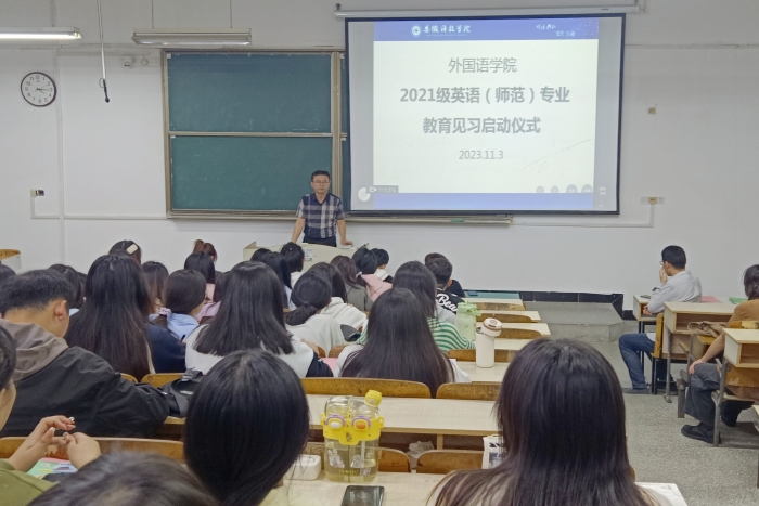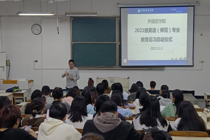 为确保外国语学院2021级英语(师范)专业学生教育见习工作顺利开展,11月3日下午,外国语学院在求知楼A101教室举行2021级英语(师范)专业教育见习启动大会。2021级英语(师范)专业全体同学参加本次会议。外国语学院副院长洪民、党委副书记张海亮出席会议,会议由英语教研室副主任吴远青主持。