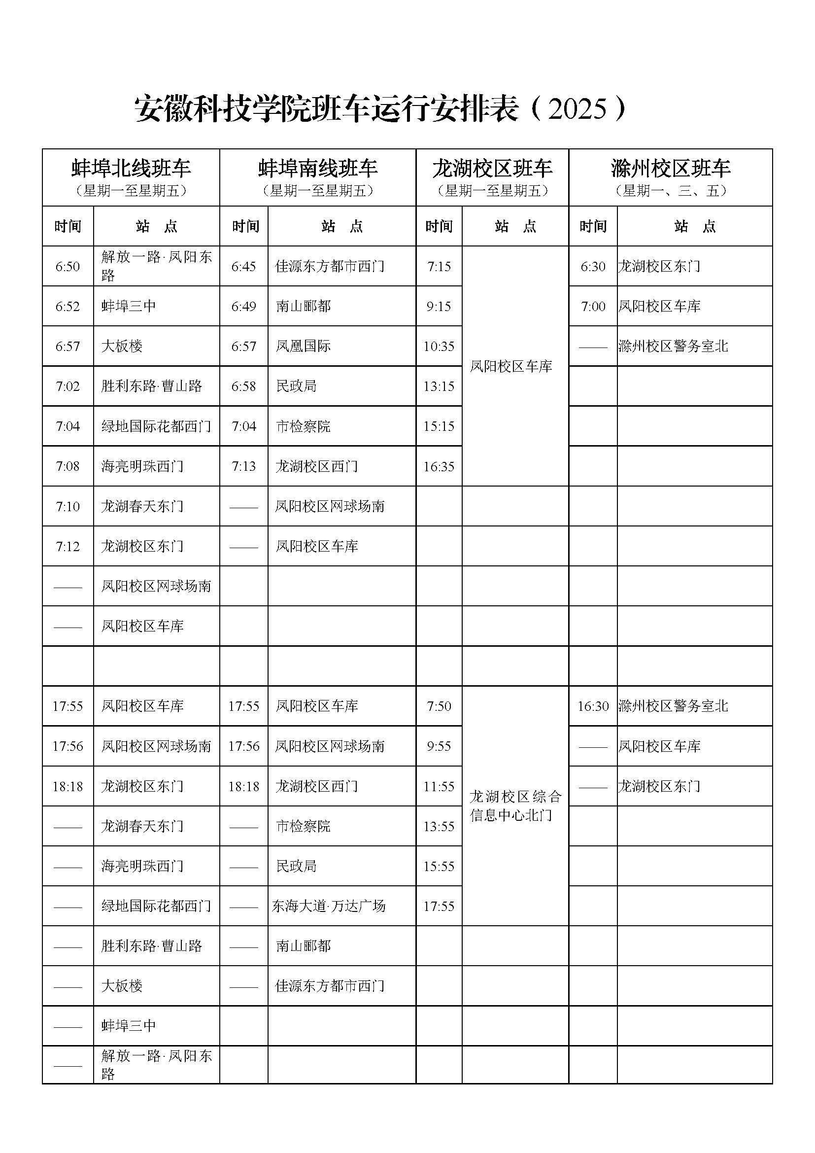 (一)蚌埠南、北线班车各站点按《MILAN.COM班车运行安排表(2025)》早上推迟15分钟发车,晚上提前10分钟发车;