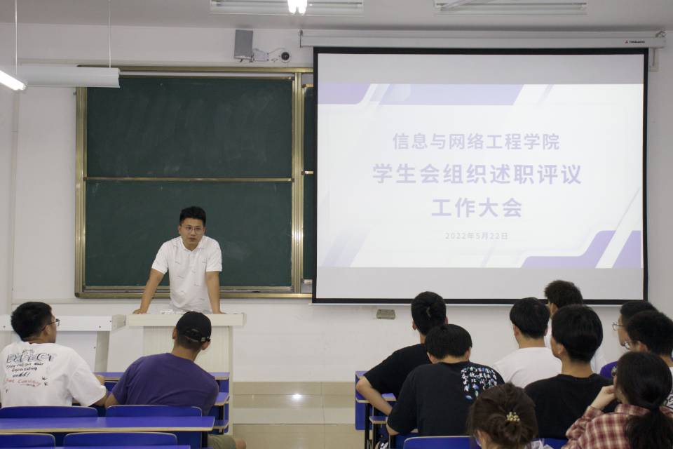 为加强学生干部队伍建设,提高学生干部的责任意识、服务意识、大局意识,5月22日晚,信息与网络工程学院在尚行楼C202召开学生会工作述职评议大会。学院学生会指导老师崔北坤、校学生会主席团成员李治云、院学生会主席团成员及各部门负责人参加本次会议,会议由崔北坤主持。