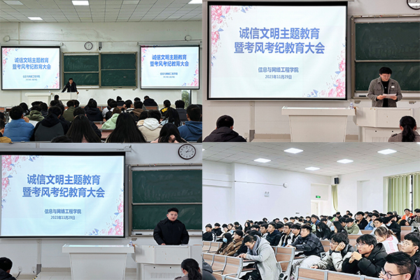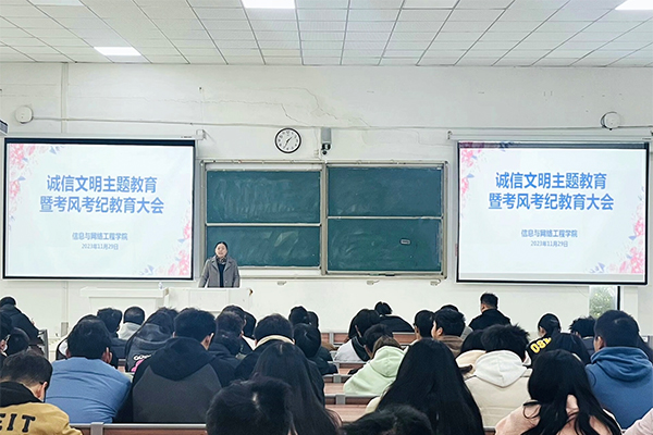 为进一步加强学院学风建设,营造良好的考试氛围。11月29日,信息与网络工程学院在致知楼C111教室,召开了诚信文明主题教育暨考风考纪教育会议。信息与网络工程学院党委副书记韦乃学、专职辅导员陈凯、丁阿敏、崔北坤、许磊出席本次大会,2023级各班班委及学生会全体成员参加会议,会议由陈凯主持。